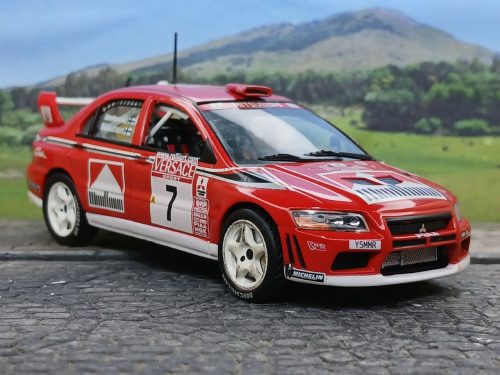Miniatura realizada por «IXO», sobre el Mitsubishi Lancer WRC, debutante en el Rally San Remo 2001, en el penúltimo tramo de la competencia.