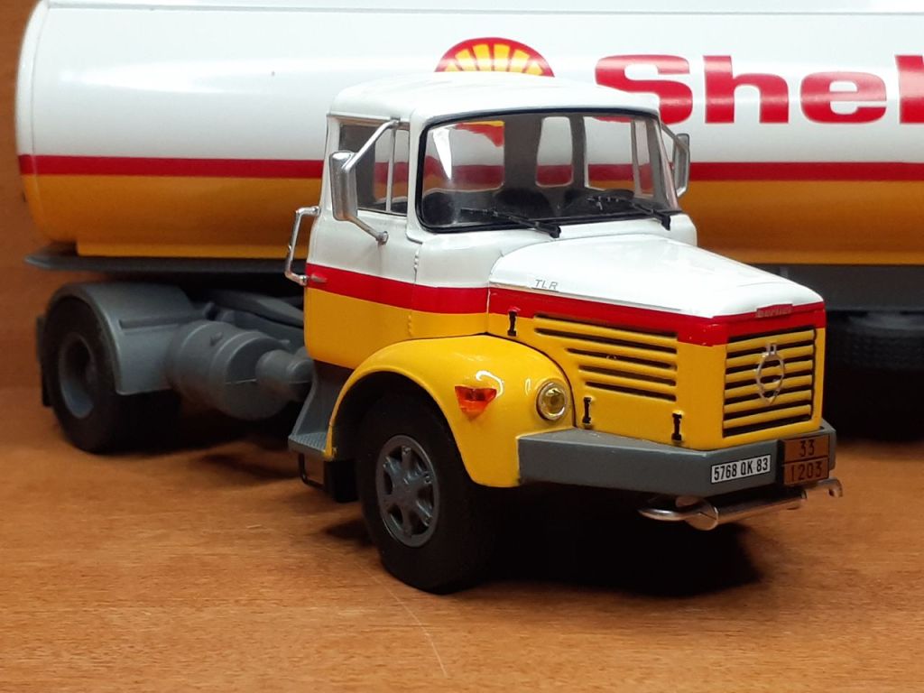 Miniatura realizada por Altaya para la colección «Camiones Articulados» (España). Con la librea propia de la empresa petrolera Shell. En detalle la nueva trompa cuadrada y comparativo con la trompa de fines de los ’50.