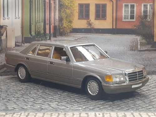 Miniatura realizada por «Minichamps» sobre un W126 de segunda serie, 560 SEL de chasis largo. Una miniatura excelente, con un color acertado y los interiores simil cuero marrón. En la parte posterior el detalle de las luces con nervaduras.