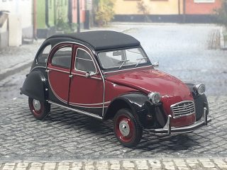 Miniatura realizada por «Minichamps» sobre un 2CV6 Charleston en su clásico color y todos los detalles en sus cromados y accesorios. La parte posterior presenta las luces para el mercado europeo y la placa que identifica el modelo.