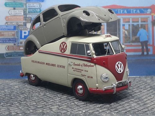 Miniatura realizada por «Schuco Pro-R» sobre un T1 de mediados de los ’50, con volante a la derecha y recortada la parte trasera para el traslado de carrocerías de Escarabajo para terminar su ensamblado.