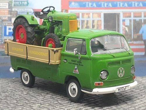 Miniatura realizada por Schuco, sobre una T2a Pick up, con una hermosa caja de madera y llevando un tractor Fendt Dieselross de fines de los ’50. Ambos modelos excelentes, con muchos detalles sobre todo el tractor. El color y combinación es más que acertado.