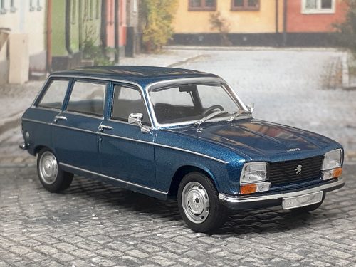 Miniatura realizada por «Minichamps» sobre un 304 Break, en un hermoso color azul metalizado. Con todos los detalles exteriores, en el comparativo lo vemos junto con la Berlina de la que deriva, también de Minichamps.