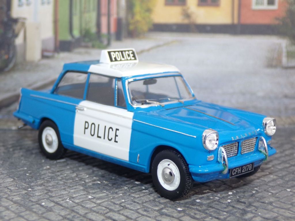 Miniatura realizada por «Premium X», sobre un Triumph Herald con los cambios presentados en 1962, para el servicio de policía. Con muy buenos detalles, destacándose los fotograbados y accesorios.
