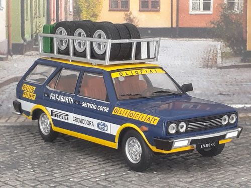 Mniatura realizada por «IXO» sobre un Fiat 131 Panorama 1600 CL , que sirve de apoyo al equipo oficial Fiat. El detalle del portaequipaje con ruedas auxiliares y bidones para combustible.