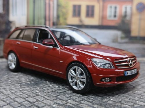 Miniatura realizada por «Schuco», sobre un Mercedes Benz C-Class en versión Rural, con un excepcional color rojo, interior con todos los calcos muy buena definición de faros y llantas.