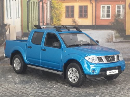 Miniatura realizada por «Norev» sobre una Nissan Navara de 2da generación , en un cálido color azul metalizado, con accesorios cromados y una buena definición de caja.