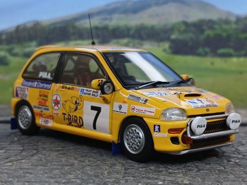Miniatura realizada por «IXO» sobre uno de los Subaru Vivio que compitieron en el Safari del año 1993, con las defensas y faros auxiliares incorporados en espejos, excelente decoración para este simpático auto.