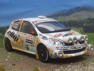 Miniatura realizada por IXO, sobre este Clio R3 (tercera generación), con el que P. Campana se alza con la victoria en la IRC 2WD y un 14° lugar en la general del Rally de Montecarlo de 2011. Se destacan sus calcos y el juego de luces auxiliares.