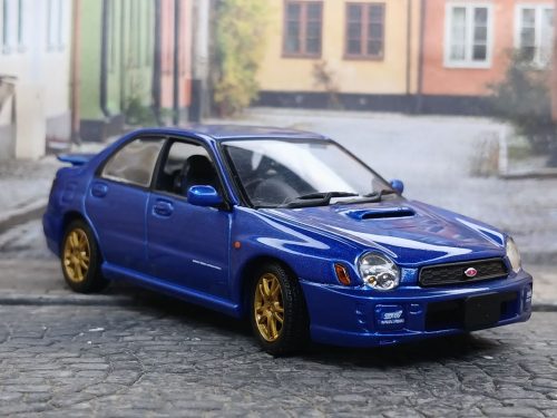 Miniatura realizada por “Autoart”, sobre un WRX STI de 2da generación, con el diseño original de faros delanteros con forma de ojo de insecto. Interior a tono con el auto, y llantas con colores dorados.