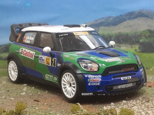 Miniatura realizada por «IXO», sobre este Mini WRC, participante del Monza Rally Show, colores llamativos, insignias correctas y el detalle de llantas e interiores completos.