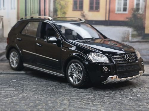 Miniatura realizada por «Minichamps», sobre un Mercedes ML 63 AMG, con los pequeños cambios del año 2008 y todos los accesorios exteriores. El interior en color oscuro y zócalos cromados.